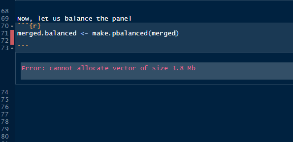 R on Windows was very good for the most part. It was fast, it ran on the packages I needed, and crashed very rarely. The issue however, did not surface until I had to do a really large ‘balancing act’. To elaborate, R gave up on me when I tried to balance a really large panel dataset using make.pbalanced function in the plm package (Linear Models for Panel Data). R constantly presented me with the “cannot allocate vector of size — GB/MB” error. This was, quite honestly a very irritating situation. For some reason, the issue did not go away with the “memory.limit()” increase. After battling with this issues for a few days, I decided it would be better for me to break down the dataset into 10 parts, balance them, and then put them back together.