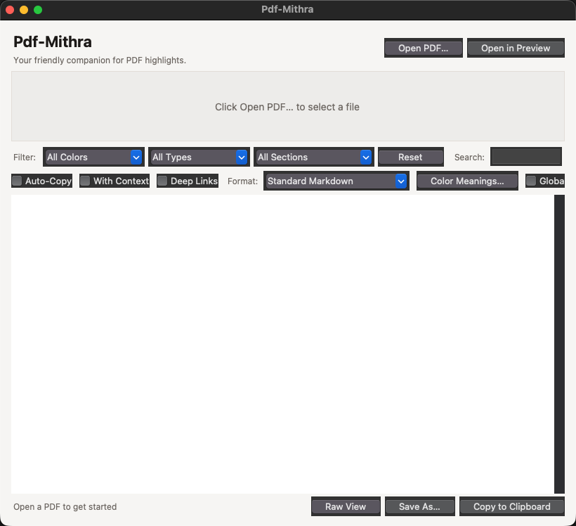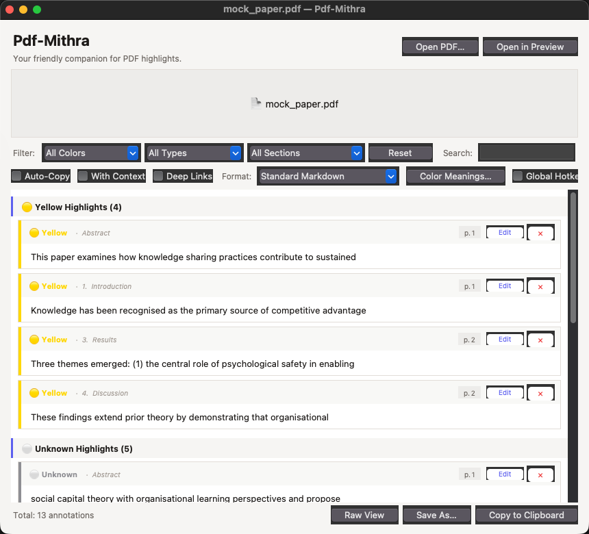 Pdf-Mithra is a free desktop app that pulls every highlight, underline, comment, and sticky note out of your PDFs and turns them into clean, structured notes — automatically grouped by the section of the document they came from.