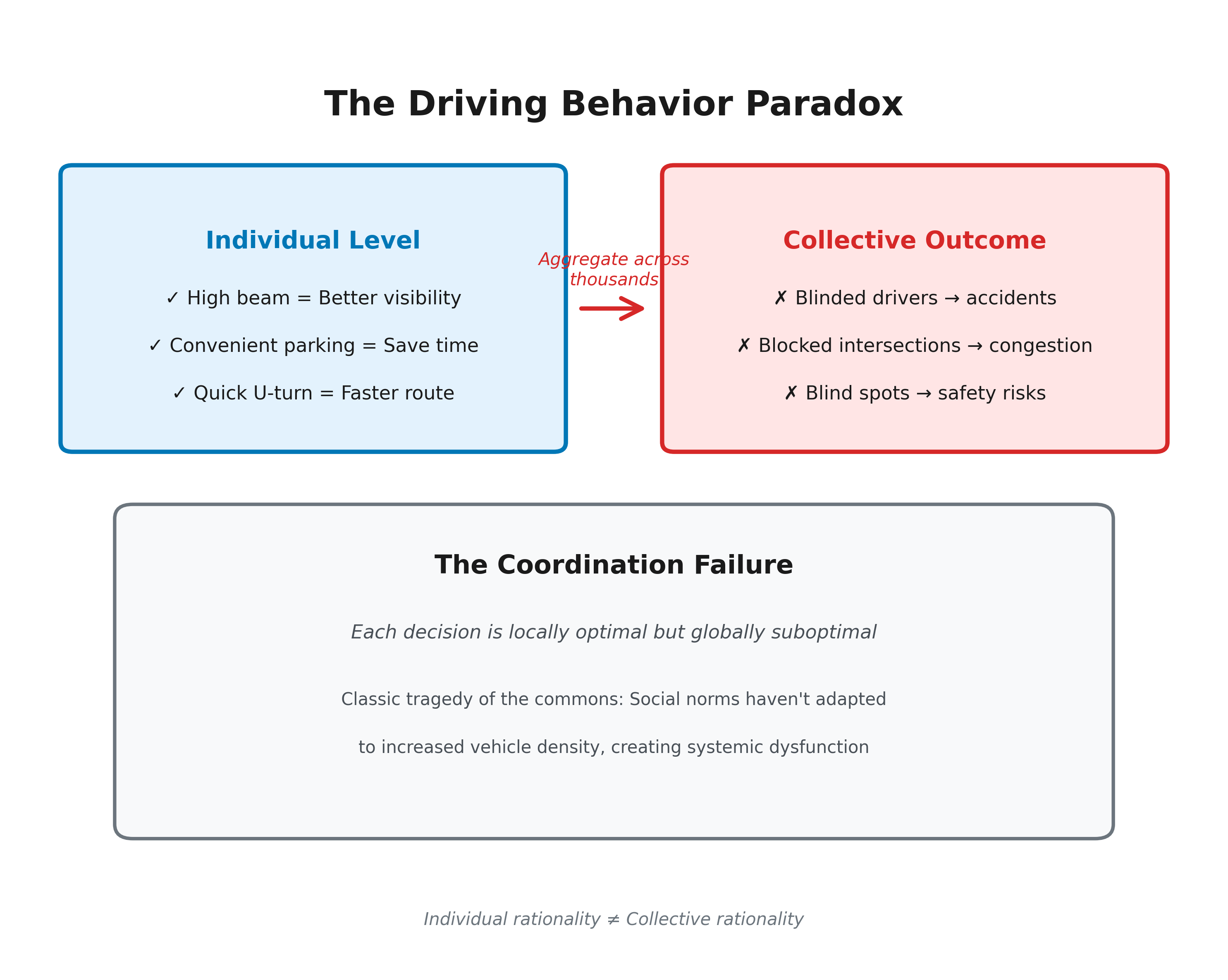 Each decision makes perfect sense at the individual level. Each driver is optimizing locally. And yet, aggregate these choices across thousands of drivers, and you get gridlock, blinded motorists, and a persistent low-grade danger that everyone just accepts as "normal."
